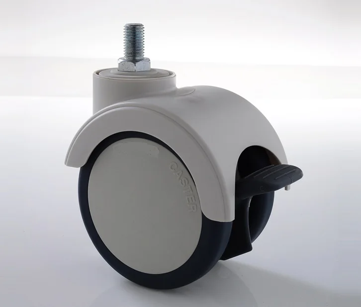 Поворотный опорный ролик с общей блокировкой, направленной блокировкой и свободным движением. Двойные колеса с точными шарикоподшипниками и крышками. Корпус и сердечник колеса изготовлены из нейлона - ПА6. Высокая несущая способность протектора колеса из ТПЭ гарантирует тихий и стабильный ход.